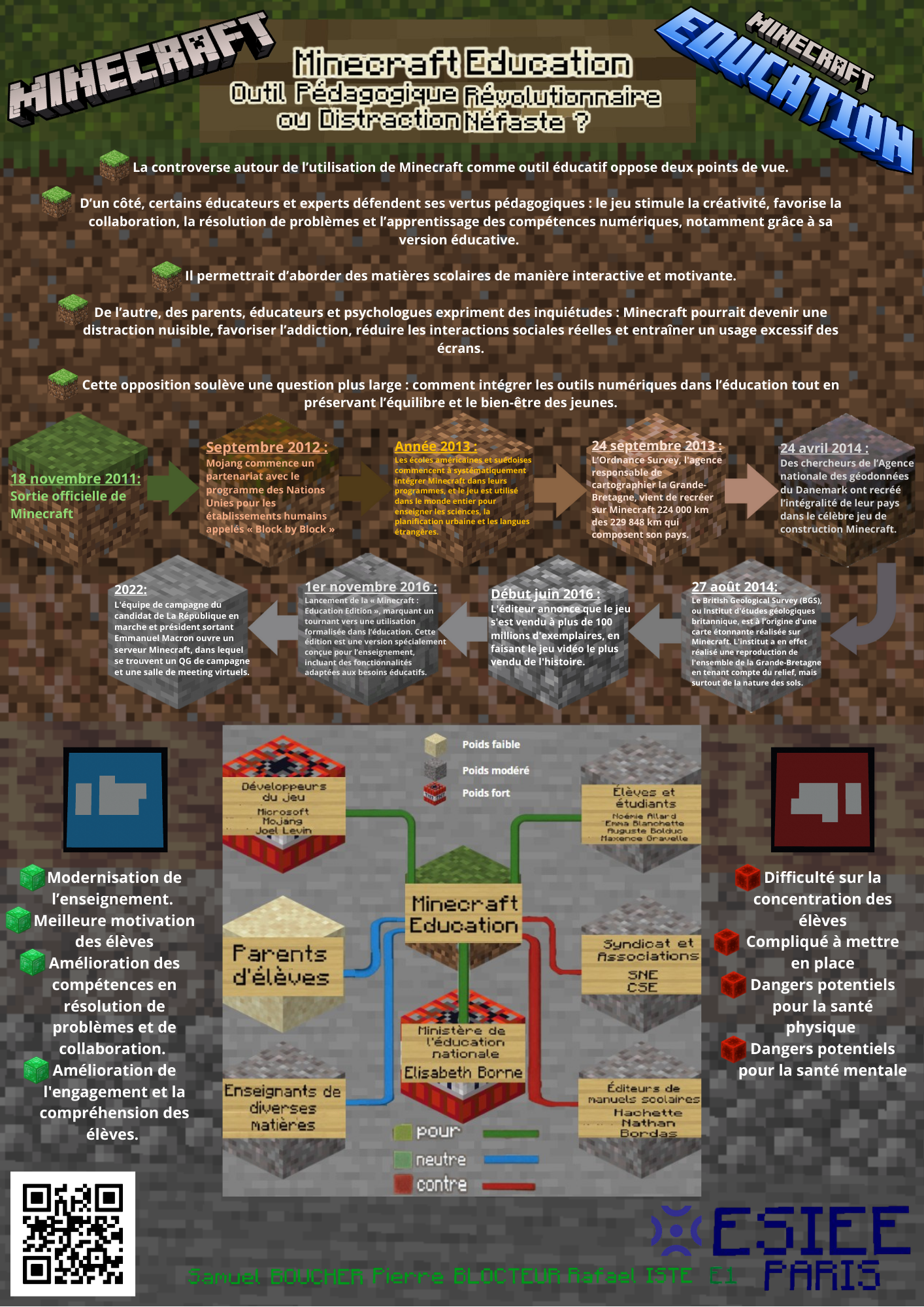 Ils considèrent Minecraft comme une plateforme innovante offrant un environnement interactif pour l’apprentissage de diverses matières (mathématiques, histoire, géographie, etc.), en permettant aux élèves de créer des structures en 3D.